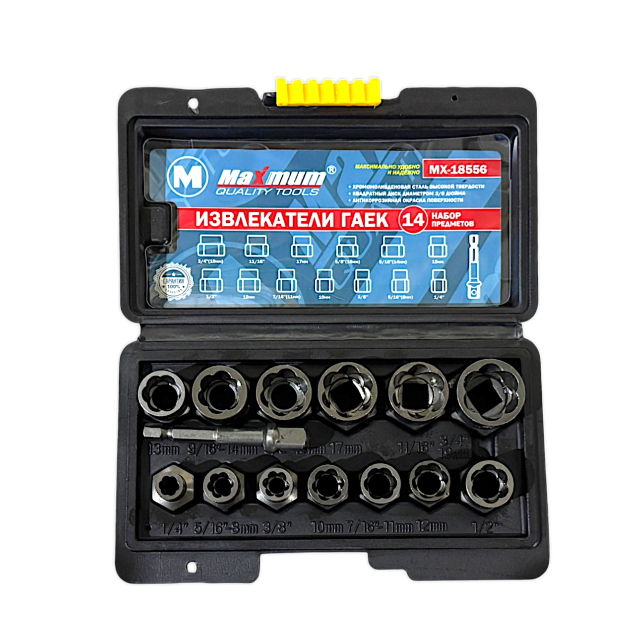 Профессиональный набор для удаления сорванных (прикипевших или закругленных) гаек и болтов от "Maximum" состоит из 13 торцевых головок и переходника 1/4.